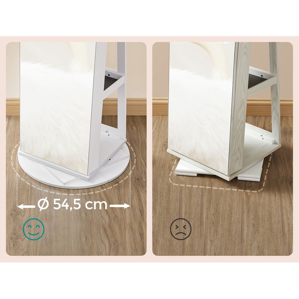 Faite pour durer : La grande base ronde de 54,5 cm de diamètre et les panneaux MDF de qualité de cette armoire à bijoux assurent sa stabilité. Le doublure intérieure en velours protège vos bijoux des rayures.