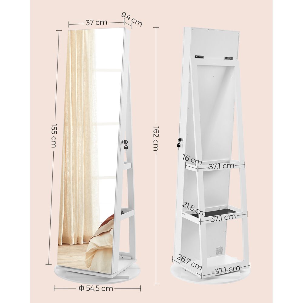 Miroir sans cadre, plus joli : Cette armoire à bijoux est munie d’un miroir sans cadre de 37 x 155 cm. Vous pouvez enfin vous regarder de la tête aux pieds pour mieux choisir vos tenues.