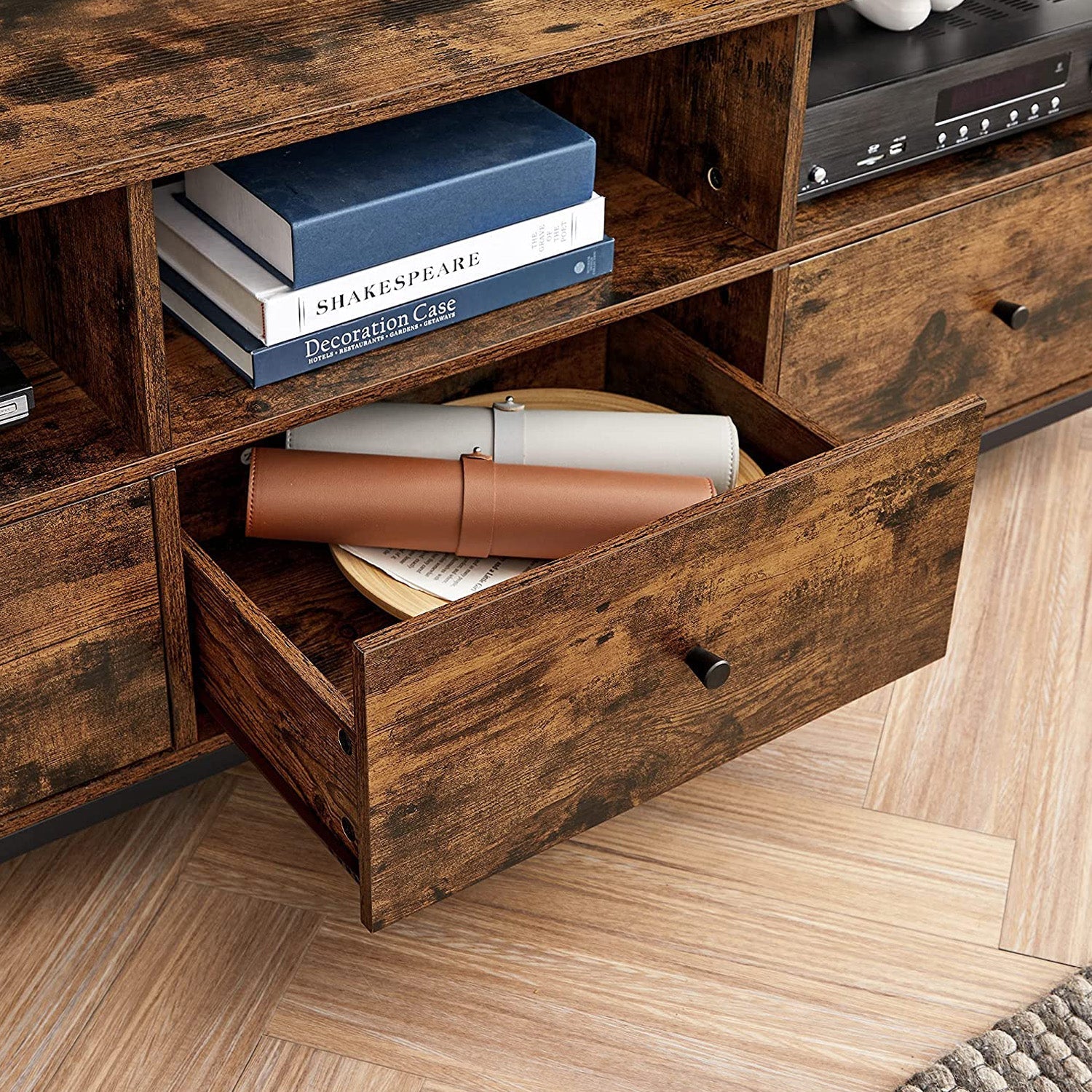 Ce que vous obtenez: Un meuble télévision avec un grand dessus, 3 compartiments ouverts, 3 tiroirs et 4 pieds réglables pour une meilleure stabilité. Équipez-vous et profitez de soirées télé relax !